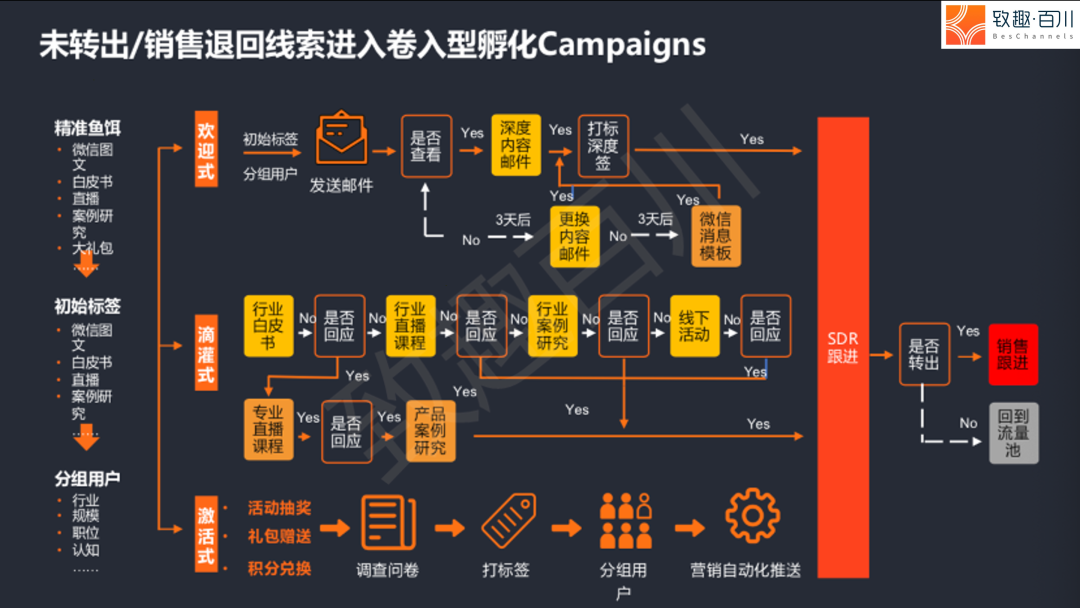 对于那些还未达到转给销售标准的低质量线索,此时没有成单不意味着未来也不会成单。所以需要有SDR的孵化过程与这些线索建立关系,通过优质的内容、活动、互动等方式,让这些潜在用户对自己的兴趣程度加深,进而变为愿意购买的用户。